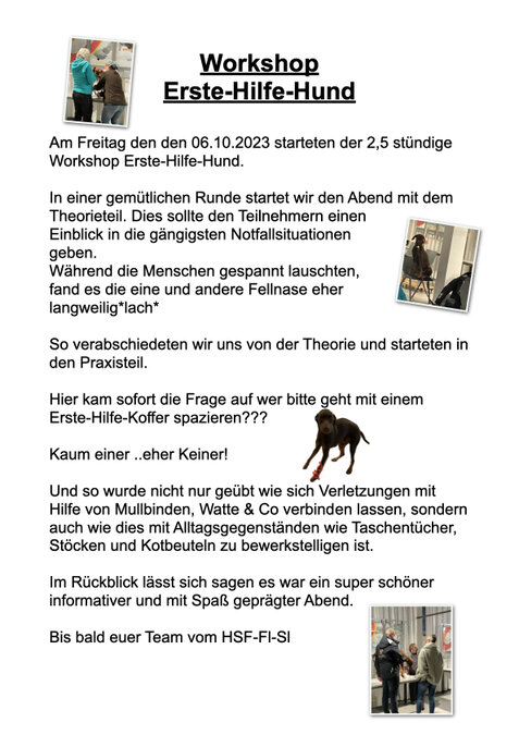 Worhshop erste-Hilfe-Hund , kleiner Theorie Teil anschliesend wurde es Praktisch:-) alle haben was gelernt und jede menge spaß aber lest selber